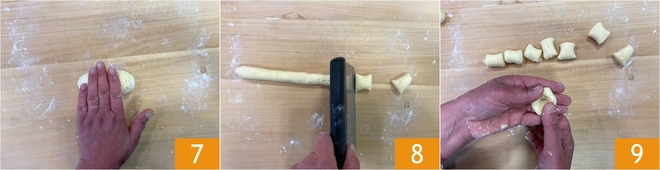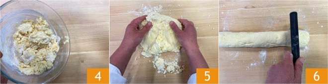 Nachdem das Mehl aufgenommen wurde 4, geben Sie den Teig auf eine leicht bemehlte Arbeitsfläche und bearbeiten ihn so wenig wie möglich 5: gerade genug, um einen weichen, aber nicht klebrigen Teig zu erhalten, dem Sie die Form einer Rolle geben. Nehmen Sie Teigstücke 6.