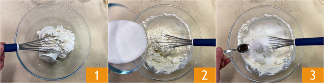 Für die Zubereitung der Ricotta-Kakaotorte ohne Mehl zuerst die Ricotta mit einem Schneebesen glatt rühren 1. In derselben Schüssel den Zucker hinzufügen 2 und das Vanilleextrakt 3.