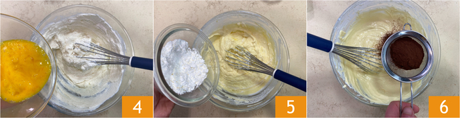 Anschließend die Eier hinzufügen 4, die Maisstärke 5 und den gesiebten Kakao 6. Gut umrühren, damit sich keine Klumpen bilden.