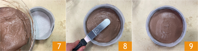 Den Teig in eine zuvor gefettete und mit Backpapier ausgelegte 20‑cm‑Form geben 7. Die Oberfläche sorgfältig glatt streichen 8 und im Umluftofen bei 170° etwa 60 Minuten backen 9.