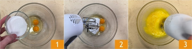 Um die Ricotta- und Orangenkrapfen mit Schokostückchen zuzubereiten, brecht die Eier in eine Schüssel, fügt den Zucker hinzu 1 und schlagt sie mit einem elektrischen Schneebesen auf 2, bis ihr eine helle und schaumige Masse erhaltet 3.