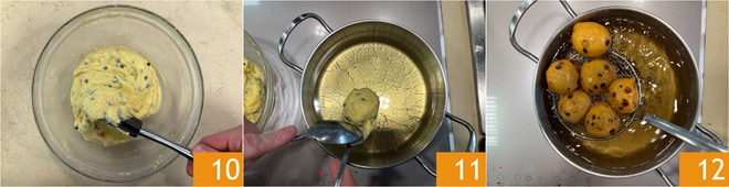 Erhitzt das Pflanzenöl in einem Topf auf 170°C. Frittiert die Krapfen: Nehmt einen Löffel Teig 10 und taucht den Teig in das heiße Öl 11. Bratet sie 3/4 Minuten oder bis sie goldbraun sind, dann hebt die Krapfen heraus 12