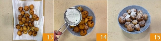 Legt sie auf ein mit Küchenpapier ausgelegtes Tablett, um das überschüssige Öl abtropfen zu lassen 13. Lasst sie leicht abkühlen und bestäubt sie nach Belieben mit Puderzucker 14. Die Ricotta- und Orangenkrapfen mit Schokostückchen sind bereit zum Genießen 15.