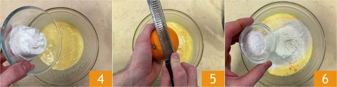 Fügt den abgetropften Ricotta hinzu 4 und aromatisiert den Teig mit der Schale einer Orange 5. Siebt nun die trockenen Zutaten separat und fügt sie dem Teig hinzu 6.
