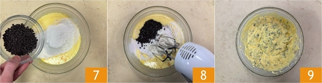 Vervollständigt mit den Schokostückchen 7 und mischt noch einmal mit dem Schneebesen 8, bis der Teig homogen ist 9.