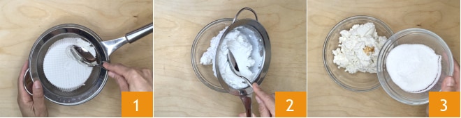 Um die Ricottacreme zuzubereiten, legen Sie den Käse in ein Sieb, das auf einer Schüssel ruht. Lassen Sie ihn 1 Stunde lang abtropfen 1. Nach der angegebenen Zeit entfernen Sie die in der Schüssel gesammelte Molke und sieben den Ricotta, indem Sie ihn mit dem Rücken eines Löffels drücken, um ihn weicher zu machen und eventuelle Klumpen zu entfernen 2. Fügen Sie den Zucker hinzu 3