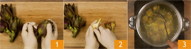 Um das Rezept für die Ricotta- und Artischocken-Küchlein zuzubereiten, müssen zunächst die Gemüse gut gereinigt werden: Entfernen Sie die äußeren Blätter 1, dann die härteren Spitzen abschneiden, vierteln und das Innere ausputzen 2. Kochen Sie die Artischocken in reichlich gesalzenem Wasser für etwa 10 Minuten ab dem Siedepunkt 3, sie sollten zart sein.