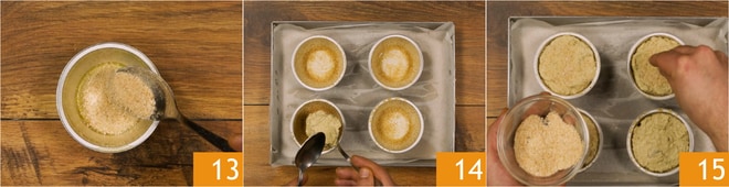 Mit Paniermehl auskleiden 13, dann mit der Artischockencreme füllen 14 und die Oberfläche mit Paniermehl bestreuen 15.
