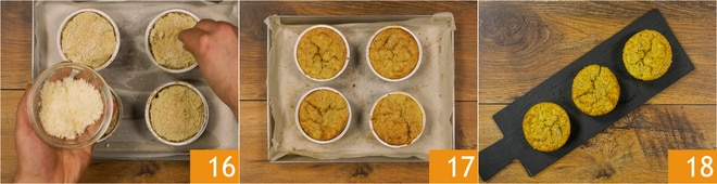 Beenden Sie, indem Sie den restlichen Käse auf der Oberfläche verteilen 16. Im vorgeheizten statischen Ofen bei 190°C für 30 Minuten backen oder bis sie gut gebräunt sind. Lösen Sie die Ricotta- und Artischocken-Küchlein 17 und servieren Sie sie lauwarm 18.