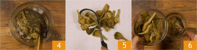 Abtropfen lassen und in eine Schüssel mit kaltem Wasser geben 4, um den Garvorgang zu stoppen. An diesem Punkt die Artischocken abtropfen lassen und mit einem Tuch trocknen 5, dann in ein hohes Glas geben 6.