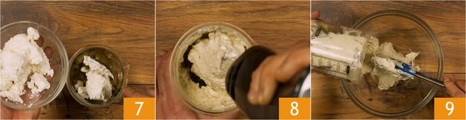 Fügen Sie auch den Schafsricotta hinzu 7 und pürieren Sie alles gut mit einem Stabmixer 8. Die Creme in eine Schüssel geben 9.