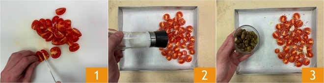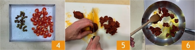 Um die Rigatoni alla puttanesca und nduja zuzubereiten, waschen und schneiden Sie die Kirschtomaten in Viertel 1. Legen Sie die Hälfte davon auf ein mit Backpapier ausgelegtes Blech und rösten Sie sie im Ofen bei 180° mit Salz, Pfeffer und Öl, bis sie zu karamellisieren beginnen 2. Nach 15 Minuten fügen Sie die Hälfte der Taggiasca-Oliven hinzu und fahren Sie mit dem Kochen für weitere 15 Minuten fort 3.
