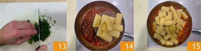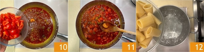 Fügen Sie den Rest der rohen Kirschtomaten hinzu 10 und lassen Sie sie etwa 15 Minuten kochen; am Ende der Garzeit entfernen Sie die Knoblauchzehe 11. In der Zwischenzeit kochen Sie die Rigatoni in reichlich gesalzenem Wasser 12.
