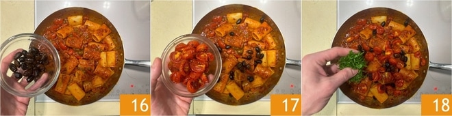 Vervollständigen Sie mit den Oliven 16 und den gerösteten Kirschtomaten 17. Würzen Sie mit reichlich Petersilie 18.