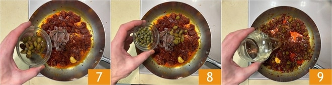 Wenn es beginnt, am Boden zu karamellisieren, fügen Sie die Sardellen, die restlichen Oliven 7 und die Kapern (vorher abgespült) hinzu 8. Kochen Sie etwa 5 Minuten, dann löschen Sie mit dem Weißwein ab 9.