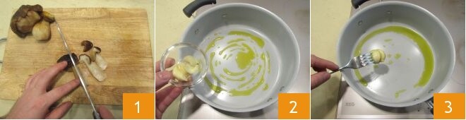 Um die Rigatoni mit Steinpilzen und Waldbeeren zuzubereiten, beginnen Sie zunächst damit, die Steinpilze vorsichtig zu waschen (für detailliertere Informationen zur Reinigung von Steinpilzen klicken Sie hier). Legen Sie die gewaschenen Steinpilze dann auf ein Schneidebrett und schneiden Sie sie in Scheiben 1. Nehmen Sie nun eine beschichtete Pfanne, beträufeln Sie sie mit etwas Öl und lassen Sie eine Knoblauchzehe darin goldbraun werden 2. Sobald der Knoblauch angebräunt ist, nehmen Sie ihn vom Herd 3.