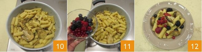 Geben Sie die al dente abgegossenen Rigatoni in die Pfanne, in der Sie die Pilze gekocht haben, und mischen Sie die Zutaten, damit sie sich gleichmäßig verbinden 10. Sollte die Sauce zu trocken sein, fügen Sie etwas Kochwasser hinzu. Einige Minuten bevor Sie die Pfanne vom Herd nehmen, fügen Sie die Waldbeeren hinzu 11, lassen Sie einige zur Dekoration übrig, und vermengen Sie sie vorsichtig mit der Pasta, damit sie möglichst ganz bleiben. Servieren Sie dann die Rigatoni mit Steinpilzen und Waldbeeren, garniert mit einer Handvoll frischer Waldbeeren, und genießen Sie die Komplimente Ihrer Gäste 12!