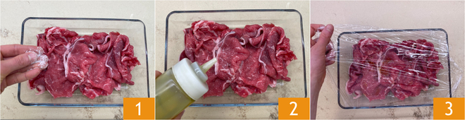 Zum Zubereiten des Rindercarpaccio würzen Sie zuerst die Scheiben vom Rumpsteak mit Salz 1, Pfeffer und Öl 2. Mit Frischhaltefolie abdecken 3 und in den Kühlschrank legen.