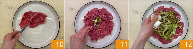 Jetzt kommt das Anrichten: Legen Sie die Fleischscheiben auf die Servierplatte 10, dann den Spargelsalat darauf anrichten 11 und gleichmäßig verteilen. Die hartgekochten Eier pellen und zerkrümeln 12.