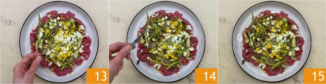 Zum Schluss mit halbierten Kapernblüten garnieren 13 und die Sardellenfilets in Rauten schneiden und darauf legen 14. Ihr Rindercarpaccio mit Spargelsalat ist bereit zum Servieren 15!