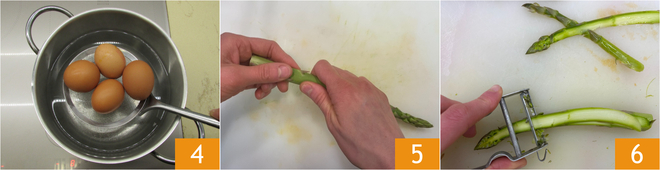 Geben Sie die Eier in einen Topf mit kaltem Wasser 4, bringen Sie dieses leicht zum Kochen und lassen Sie die Eier ab diesem Zeitpunkt 7 Minuten garen. In der Zwischenzeit Wie man Spargel putzt: das holzige Ende an der Basis entfernen 5 und die Stangen dann längs mit einem Sparschäler dünn hobeln 6.