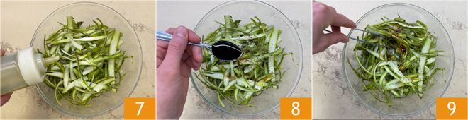 Geben Sie den Spargel in eine Schüssel und würzen Sie ihn mit Öl 7, Salz, Pfeffer und Balsamico-Essig 8. Vorsichtig vermengen 9.