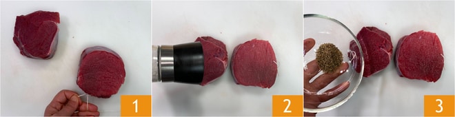 Um das Rinderfilet mit Pfeffer und Kürbiscreme zuzubereiten, binden Sie zunächst die Filets mit Küchengarn zusammen 1. Würzen Sie nun die Filets auf beiden Seiten mit Salz 2 und der Pfeffermischung 3.