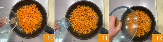 Salzen und pfeffern 10. Mischen und 100 g Wasser dazugeben 11, dann mit einem Deckel abdecken 12 und etwa 15 Minuten bei mittlerer Hitze kochen.