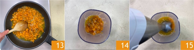 Der Kürbis sollte weich sein 13. Sobald er fertig ist, geben Sie ihn in einen hohen Behälter 14 und pürieren ihn mit einem Stabmixer 15.