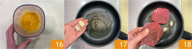 Sie sollten eine glatte Creme erhalten 16. Erhitzen Sie eine beschichtete Pfanne mit 2 Knoblauchzehen und einem Schuss Öl 17, legen Sie die Filets hinein 18.