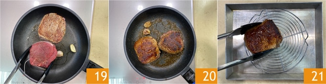 Nach 7-8 Minuten die Filets wenden 19 für eine mittlere Garstufe; die Zeit hängt von der Dicke des Fleisches ab. Lassen Sie es nun auch auf der anderen Seite für 7-8 Minuten 20 kochen. Legen Sie das Filet auf ein Gitter 21 und lassen Sie es dort weitere 7-8 Minuten ruhen.