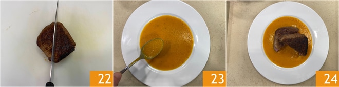 Teilen Sie das Filet in zwei Hälften 22, gießen Sie die Kürbiscreme auf den Teller 23, würzen Sie die Creme mit der Pfeffermischung und legen Sie das Fleisch darauf. Das gewürzte Rinderfilet mit Kürbiscreme ist bereit zum Genuss 24.