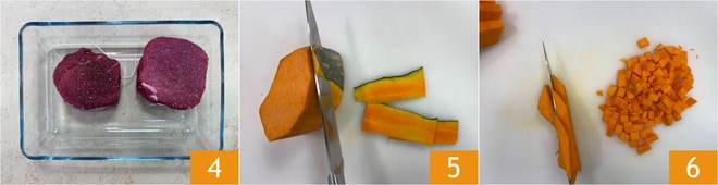Legen Sie es in eine Schüssel 4, decken Sie es mit Frischhaltefolie ab und lassen Sie es bei Raumtemperatur, während Sie den Rest vorbereiten. Nun den Kürbis säubern 5 und in kleine Würfel schneiden 6, je kleiner die Würfel sind, desto schneller kocht der Kürbis.