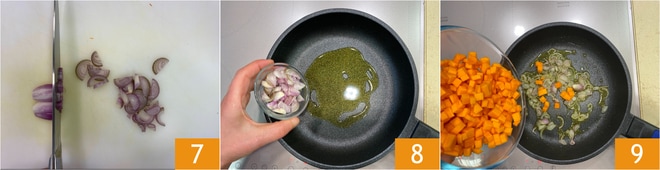 Die Schalotte fein hacken 7. In einer Pfanne einen Schuss Öl, die Schalotte 8 bei niedriger Hitze etwa 2-3 Minuten dünsten. Die in Würfel geschnittenen Kürbisse zugeben 9.
