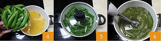 und tauchen Sie sie in den Topf mit der Brühe 4, decken Sie den Topf mit einem Deckel ab und lassen Sie die Schoten 60 Minuten bei mittlerer Hitze ab dem Zeitpunkt, an dem die Brühe wieder zu kochen beginnt, kochen 5. Nach dem Kochen pürieren Sie die Schoten mit einem Stabmixer, ohne sie aus der Brühe zu nehmen 6