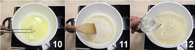 Lassen Sie in einem Topf die zwei Knoblauchzehen mit dem Olivenöl extra vergine anbraten. Sobald sie goldbraun sind, entfernen Sie sie 10 und fügen Sie den Reis hinzu; rösten Sie ihn einige Minuten bei schwacher Hitze an, indem Sie ihn häufig umrühren 11, um zu verhindern, dass er am Boden des Topfes kleben bleibt, und löschen Sie dann mit dem Weißwein ab 12.
