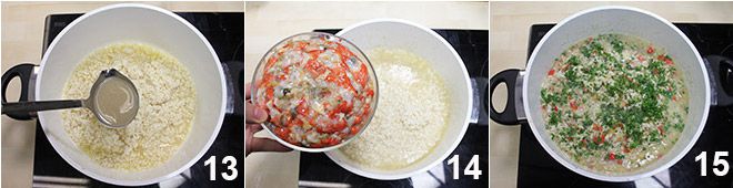 Setzen Sie das Kochen fort, immer bei schwacher Hitze, für etwa 20 Minuten, indem Sie nach und nach die Flüssigkeit der Venusmuscheln hinzufügen 13 (denken Sie daran, den Reis nur zu benetzen, wenn er die zuvor hinzugegebene Flüssigkeit vollständig aufgenommen hat). Da das Wasser der Venusmuscheln sehr salzig ist, empfehlen wir, den Reis zu probieren: Wenn er zu salzig erscheinen sollte, können Sie die Flüssigkeit der Venusmuscheln mit Fischbrühe oder Wasser abwechseln. Sobald der Reis fast gar ist, fügen Sie die Venusmuscheln 14, reichlich gehackte Petersilie 15 hinzu und vermengen Sie alles gut mit einem Holzlöffel.