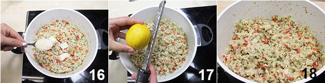 Sobald der Reis die gewünschte Garstufe erreicht hat, schalten Sie das Feuer aus; rühren Sie den Butter, den Parmigiano Reggiano 16 und die Schale einer halben Zitrone 17 unter. Ihr Risotto mit Venusmuscheln ist fertig, servieren Sie es und genießen Sie es sofort 18.