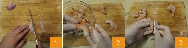 Um das Risotto mit Sepiatinte und Garnelen zuzubereiten, beginnt ihr mit der Zubereitung der Gemüsebrühe und hackt die Schalotte fein 1. Dann geht es an die Reinigung des Fisches: Pellt die Garnelen 2. Sobald sie außen gereinigt sind, entfernt ihr den Darm, indem ihr den Rücken der Garnele einschneidet und ihn vorsichtig mit einem Zahnstocher herauszieht, ohne ihn zu brechen 3. Legt die Garnelen beiseite.