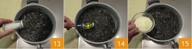 Wenn noch 3-4 Minuten bis zum Ende der Risotto-Garzeit verbleiben, würzt mit Salz 13 und Pfeffer. Schaltet die Hitze aus und vermischt mit 20 g Öl 14 und dem geriebenen Käse 15. Vermischt die Zutaten gut, um sie zu verbinden.