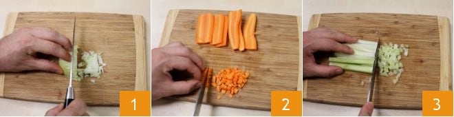 Um das Zander-Risotto zuzubereiten, beginnen Sie mit dem Fischfond, indem Sie die Reste des Zanders verwenden. Sobald er fertig ist, fahren Sie mit der Zubereitung des Soffritto fort. Waschen und schälen Sie die Karotten, die Zwiebel und den Sellerie, und hacken Sie sie dann fein mit einem Messer (1-2-3).