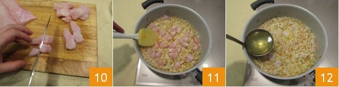 In der Zwischenzeit schneiden Sie den Zander in 0,5 cm große Stücke 10. Zur Hälfte der Garzeit fügen Sie die Hälfte der Fischstücke zum Risotto hinzu 11; setzen Sie die Garung mit dem Fischfond fort, indem Sie leicht salzen und pfeffern 12.