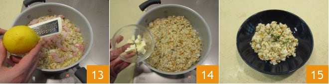 Fast am Ende der Garzeit (ungefähr 5 Minuten vorher) fügen Sie die restlichen Zanderstücke und die abgeriebene Schale einer halben Zitrone hinzu 13. Nach dem Ende der Garzeit rühren Sie die Butter in Würfeln ein 14 und servieren Sie Ihr Zander-Risotto gut heiß 15!