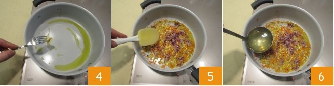 Erhitzen Sie in einer ausreichend großen Pfanne das Öl mit der Knoblauchzehe und sobald sie angeröstet ist, entfernen Sie sie mit Hilfe einer Gabel 4. Fügen Sie dann das fein gehackte Gemüse hinzu, rühren Sie um 5 und lassen Sie es ein paar Minuten dünsten, indem Sie eine Kelle Fischfond hinzufügen 6.