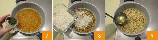Sobald es verdampft ist, fügen Sie die fein gehackten Kräuter hinzu 7. Geben Sie den Reis hinzu und rösten Sie ihn ein paar Minuten an 8, dann löschen Sie mit Weißwein ab und setzen die Garung fort, indem Sie nach und nach den Fischfond hinzufügen 9.