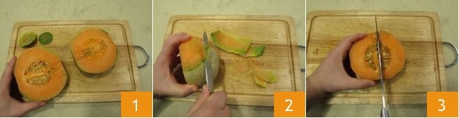Um das Risotto mit Schinken und Melone zuzubereiten, beginnen Sie damit, die Melone von beiden Enden zu befreien und sie in der Mitte durchzuschneiden 1. Entfernen Sie die äußere Schale mit einem Messer 2 und teilen Sie jede Hälfte erneut in 2 gleiche Teile 3.