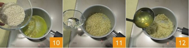 Wenn sie verwelkt ist, fügen Sie den Reis hinzu 10 und lassen Sie ihn einige Minuten rösten. Dann mit Weißwein ablöschen 11. Wenn der Wein verdampft ist, fügen Sie eine Kelle Gemüsebrühe hinzu 12. Rühren Sie das Risotto von Zeit zu Zeit um und fügen Sie eine Kelle Brühe hinzu, nur wenn die vorherige vollständig aufgesogen wurde.