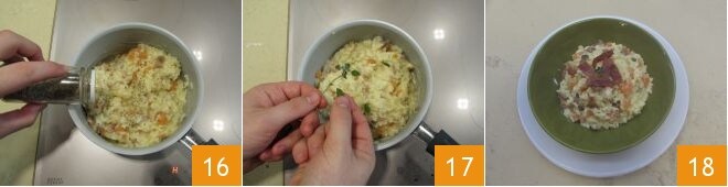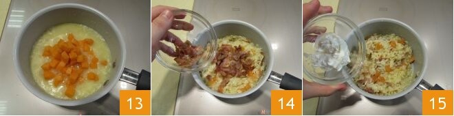 Gegen Ende der Garzeit fügen Sie die Melone 13 und den Schinken 14 hinzu und lassen Sie einige Stücke für die endgültige Dekoration übrig, und mischen Sie alles. Sobald das Risotto gekocht ist, nehmen Sie es vom Herd und fügen Sie die Stracciatella hinzu, um es zu binden 15, und rühren Sie weiter, bis es schmilzt, um ein cremiges Risotto zu erhalten.