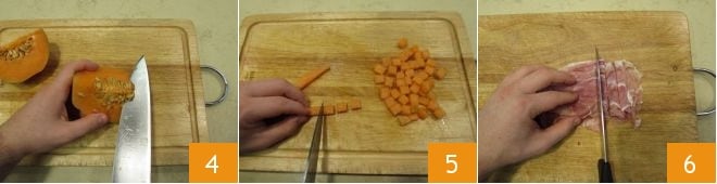 Entfernen Sie die innere Partie mit den Samen 4 und schneiden Sie sie in nicht zu dicke Scheiben, die Sie in etwa halbe Zentimeter große Würfel schneiden 5. Beiseitelegen und in der Zwischenzeit den Schinken nehmen und in etwa 1 cm dicke Streifen schneiden 6.