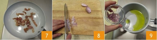 Braten Sie sie in einer antihaftbeschichteten Pfanne einige Minuten lang, ohne Öl hinzuzufügen 7: Sobald eine leichte Kruste auf der Oberfläche entsteht, sind sie fertig. Jetzt die Schalotte fein hacken 8. Geben Sie sie in einen großen Topf und braten Sie sie mit einem Schuss Öl an 9.